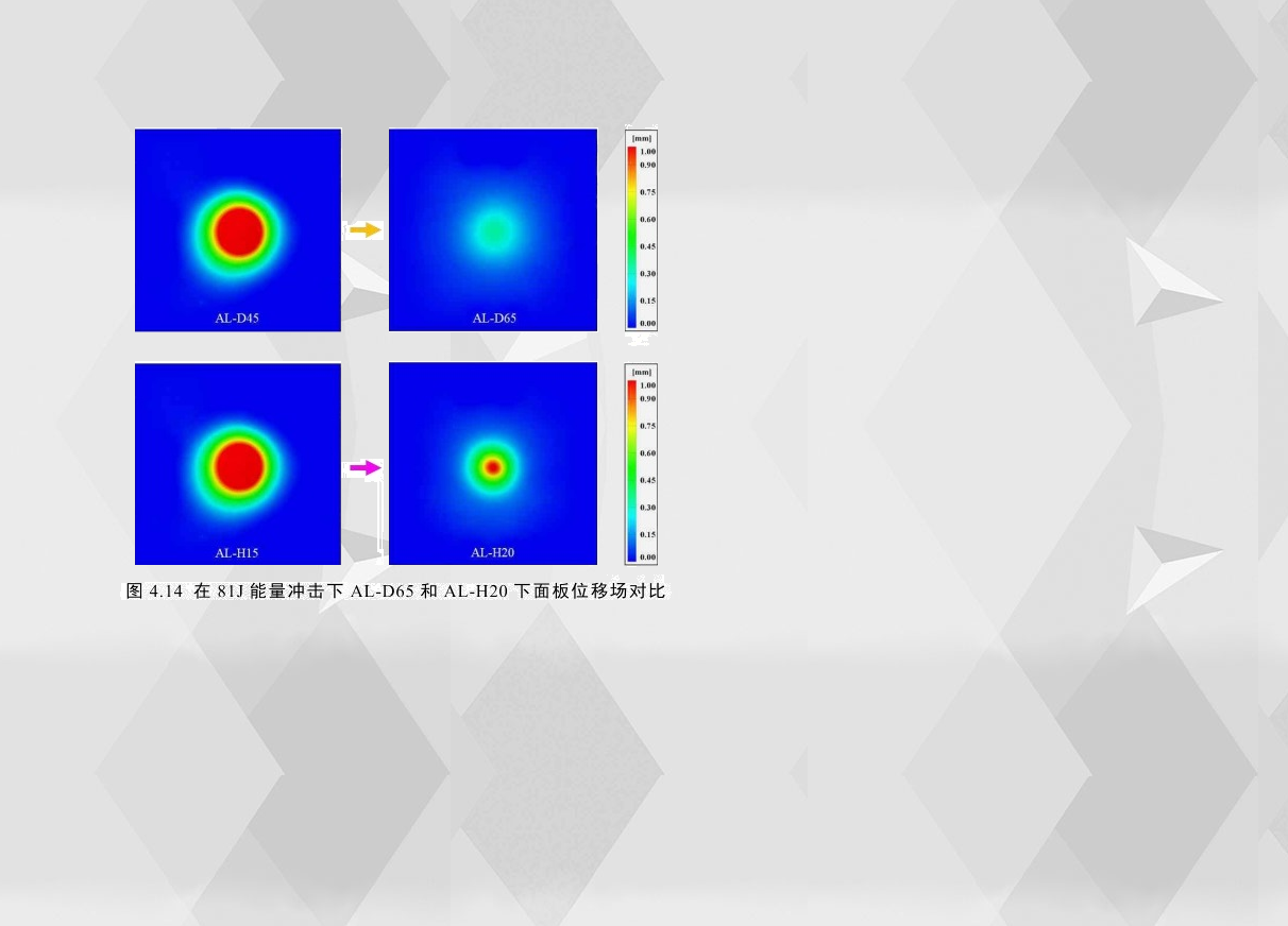 從這些種試件的重量而言,AL-H15到AL-H20增加的質量與AL-D45到AL-D65增加的質量幾乎相同,而結合其耐撞性以及比較芯層中密度(AL-D45)到高密度(AL-D65)和芯層中厚度(AL-H15)到芯層高厚度(AL-H20)在相同能量沖擊下的下面板的變形量來說,如圖4.14所示,提高夾層結構泡沫芯層的密度比增加泡沫芯層的高度更能改善其耐沖擊性能。